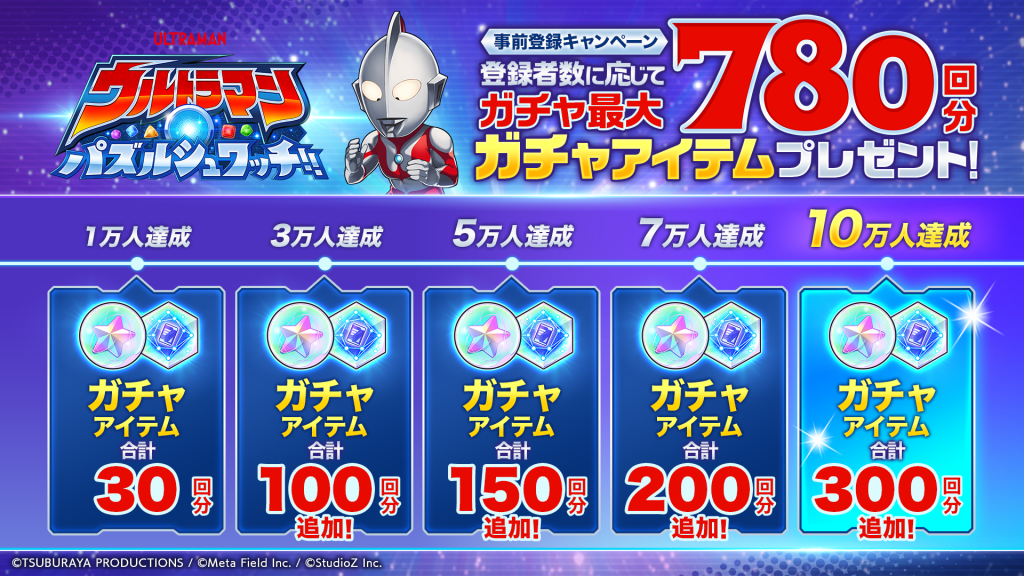 円谷フィールズホールディングスのデジタル事業戦略子会社であるメタフィールド株式会社(本社:東京都渋谷区、代表取締役社長 大塩 忠正、以下「メタフィールド」)は、株式会社円谷プロダクション(本社:東京都渋谷区、代表取締役社長 永竹 正幸、以下「円谷プロ」)の監修のもとで開発中の新作スマートフォン向けアプリゲーム『ウルトラマン パズルシュワッチ!!(通称:パズシュワ)』の事前登録を開始いたしました。