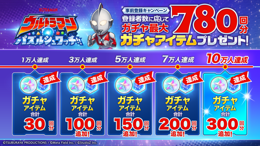 円谷フィールズホールディングスのデジタル事業戦略子会社であるメタフィールド株式会社(本社:東京都渋谷区、代表取締役社長 大塩 忠正、以下「メタフィールド」)は、株式会社円谷プロダクション(本社:東京都渋谷区、代表取締役社長 永竹 正幸、以下「円谷プロ」)監修のもとで開発中のスマートフォン向けアプリゲーム『ウルトラマン パズルシュワッチ!!(通称:パズシュワ)』の事前登録者数が10万人を突破したことをお知らせいたします。