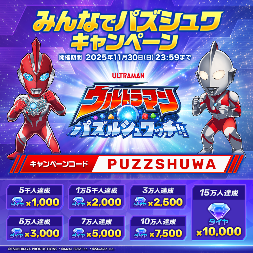 円谷フィールズホールディングスのデジタル事業戦略子会社であるメタフィールド株式会社(本社:東京都渋谷区、代表取締役社長 大塩 忠正、以下「メタフィールド」)は、株式会社円谷プロダクション(本社:東京都渋谷区、代表取締役社長 永竹 正幸、以下「円谷プロ」)監修のスマートフォン向けアプリゲーム『ウルトラマン パズルシュワッチ!!(通称:パズシュワ)』のサービスを正式に開始いたしました。
