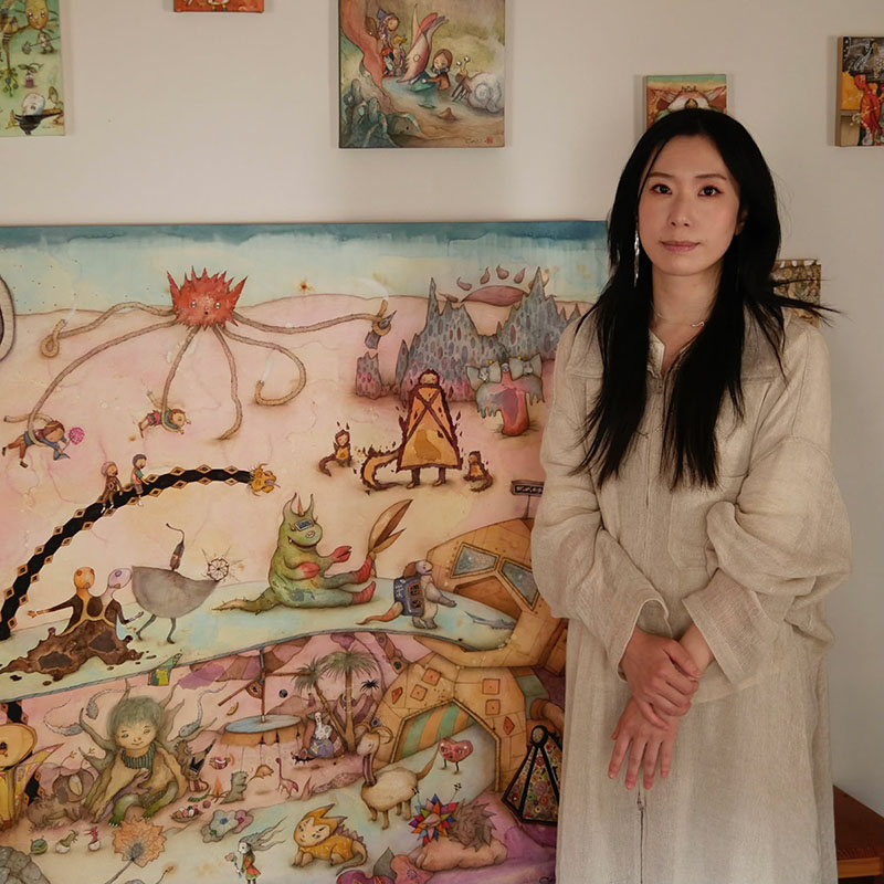 自ら創り続けてきたキャラクター図鑑から、登場人物たちをキャスティングし、言葉遊びや記憶の断片を重ねながら、〈生き物〉たちが 自由に戯れる物語空間を描き出している。