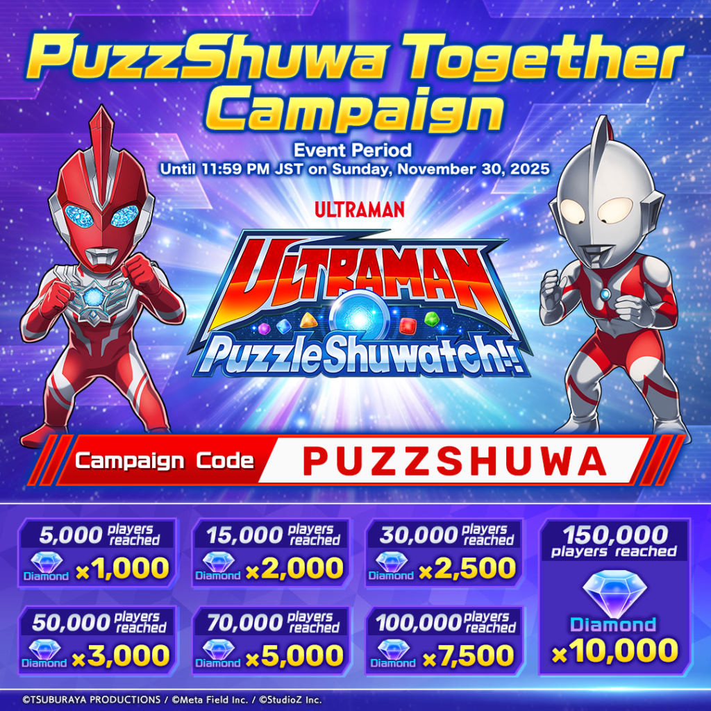 Metafield Inc. (Headquarters: Shibuya-ku, Tokyo; President and CEO: Tadamasa Oshio; hereinafter “Metafield”), a digital business strategy subsidiary of Tsuburaya Fields Holdings, has officially commenced service for the smartphone app game “Ultraman Puzzle Shuwatch!!”, supervised by Tsuburaya Productions Co., Ltd.